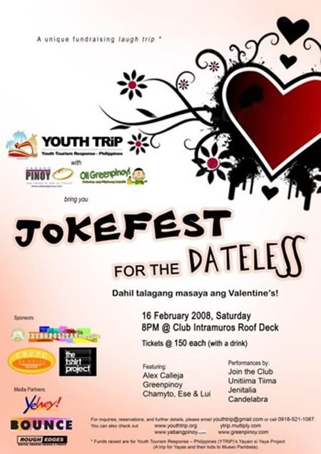 Oh well… as I was saying, I hope you’d all check him out as he does his wacky antics live tomorrow (February 16) , 8 P.M., at the Club Intramuros Roof Deck for Jokefest for the Dateless!